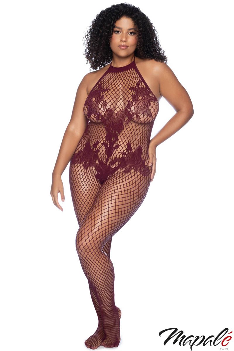 Bodystocking en filet brodé de dentelle fleurie à l'avant avec un col haut licou noué à l'arrière et à la fourche ouverte. (G-string non inclus. 95% Polyamide, 5% Élasthanne, QUEEN, NOIR, CERISE