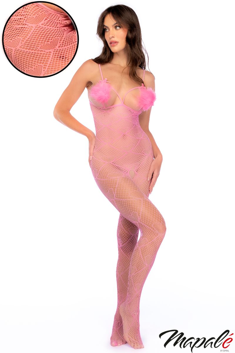 Bodystocking en filet motif coeur avec des élastiques autour des bonnets ouverts décorés de gros pompoms, de minces bretelles élastiques et à la fourche ouverte. 95% Polyamide, 5% Élasthanne, O/S, ROSE